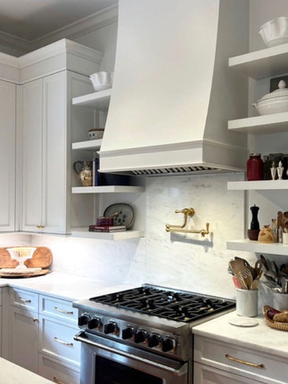 This home effortlessly fuses the modern with the traditional. The kitchen features open shelving that offers a stylish display for the client's accessories. The use of two-tone cabinets adds a modern touch, while brass fixtures bring a sense of sophistication. The addition of the large kitchen window allows much needed natural light, completing the overall design by creating a welcoming and balanced atmosphere. In the living room and dining room, the design harmoniously marries antique and modern pieces, with the homeowner's extensive collection of antiques becoming a focal point in styling the space. This eclectic approach results in a home that exudes character and charm.